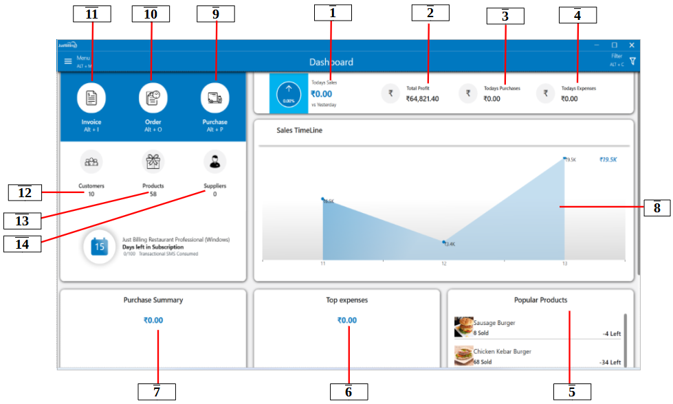 11. Invoice : This icon lets user to access the billing screen to make transactions.