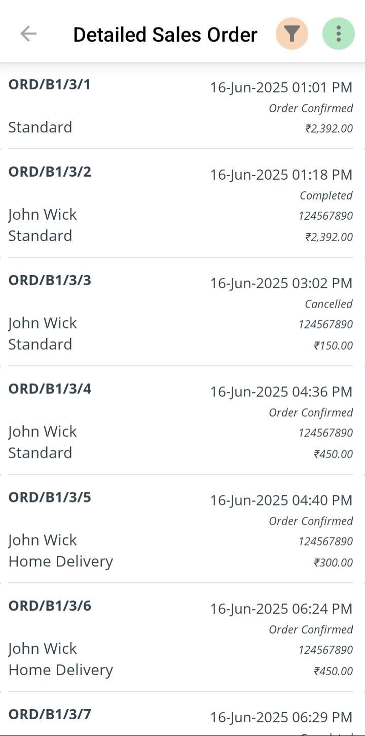 This "Detailed Sales Order" report provides a comprehensive list of all your sales orders, like ORD/B1/3/1 and ORD/B1/3/2, for June 16, 2025. You can see the order status (e.g., "Order Confirmed" or "Cancelled"), the customer's name, and the total value of each order. This helps you track the progress and financial details of every sale.