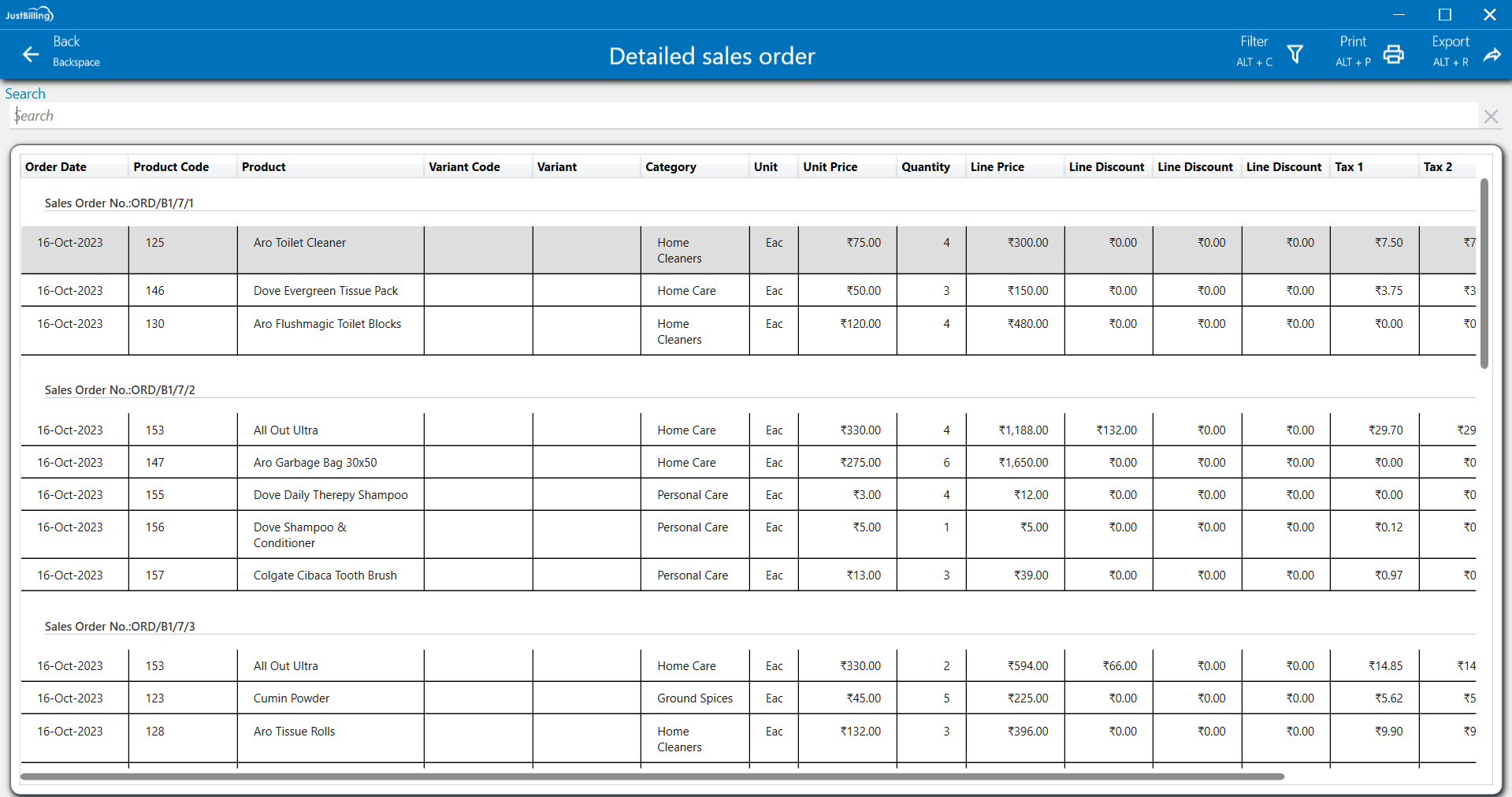 This "Detailed Sales Order" report provides a comprehensive list of all your sales orders, like ORD/B1/3/1 and ORD/B1/3/2, for June 16, 2025. You can see the order status (e.g., "Order Confirmed" or "Cancelled"), the customer's name, and the total value of each order. This helps you track the progress and financial details of every sale.