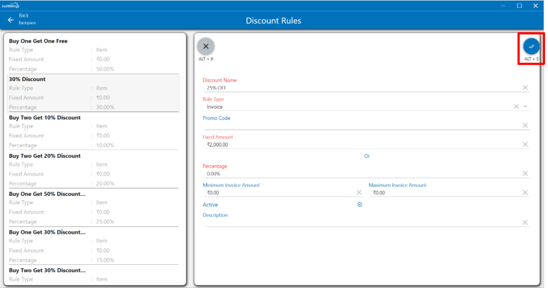 Note: Discount rule added from Just billing application will get synced to JB cloud Back office by Auto Sync.