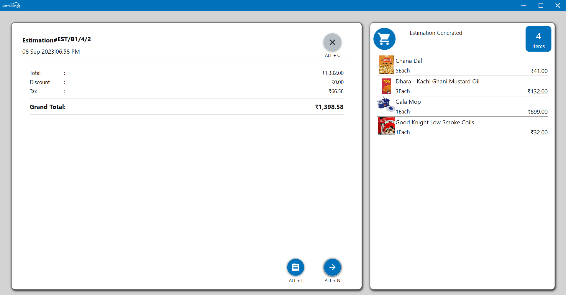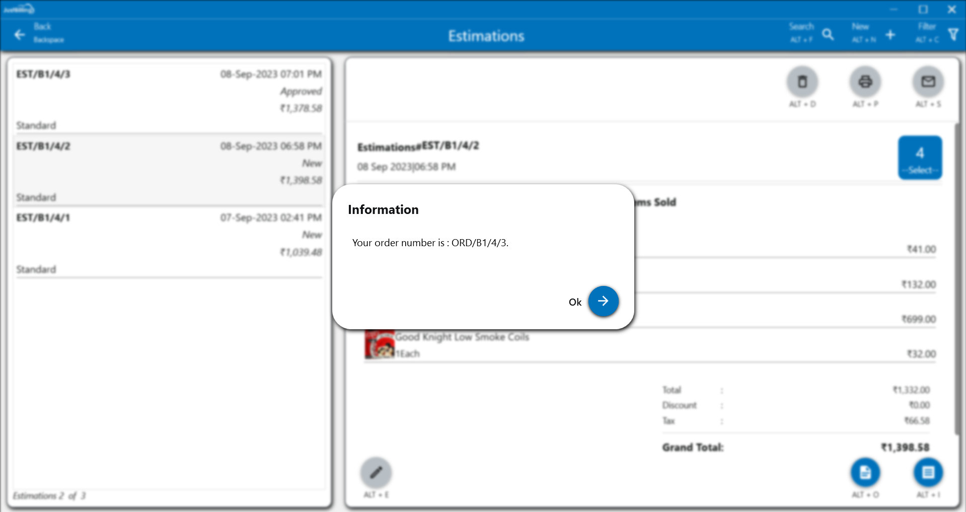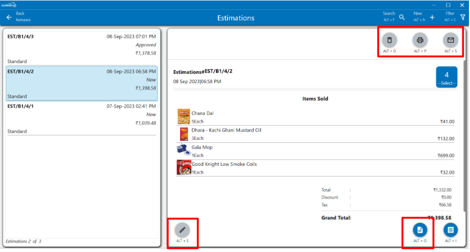 Note : It is possible to recall an estimation, and convert the estimation in to an order or Invoice which is explained below.