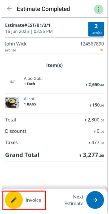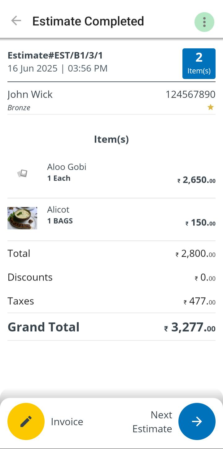 To convert the estimation to either order / Invoice click on appropriate button as shown above and follow the instructions as provided in Order and Invoice pages in user guide.