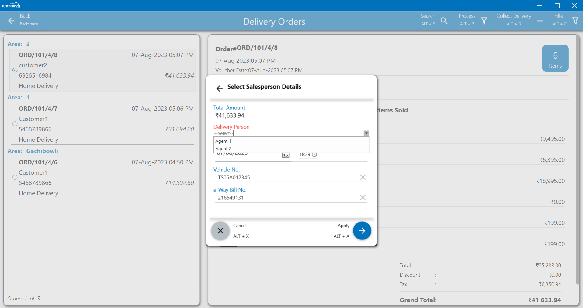 After clicking process button a pop-up is opened to select the delivery person, date and time selection, vehicle number and e-way bill number (the field in the red mark are mandatory) and click on apply button as shown in below picture.