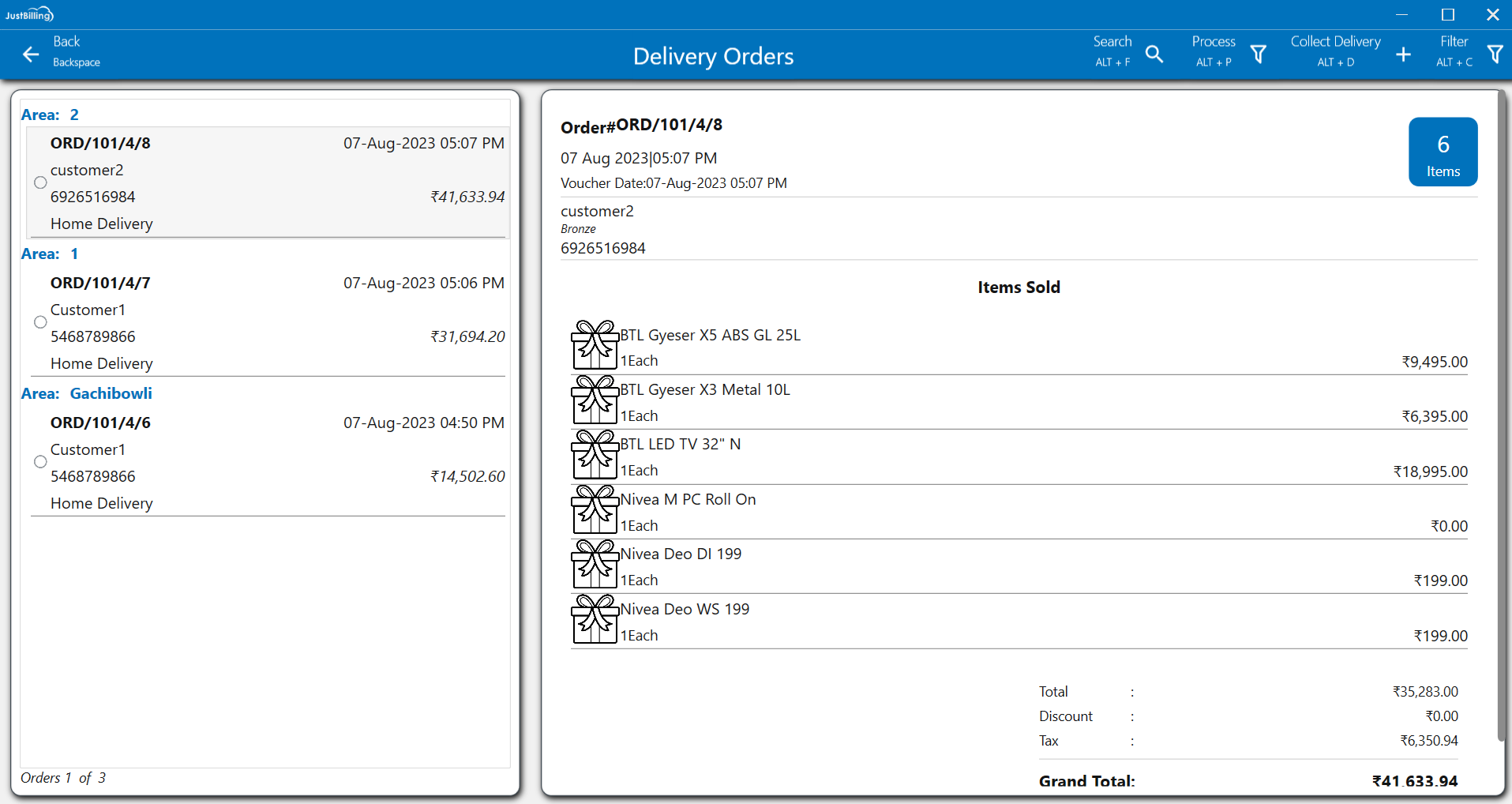 Select the Order number need to deliver from the list or you can search the order by order number from the search bar and click on process button