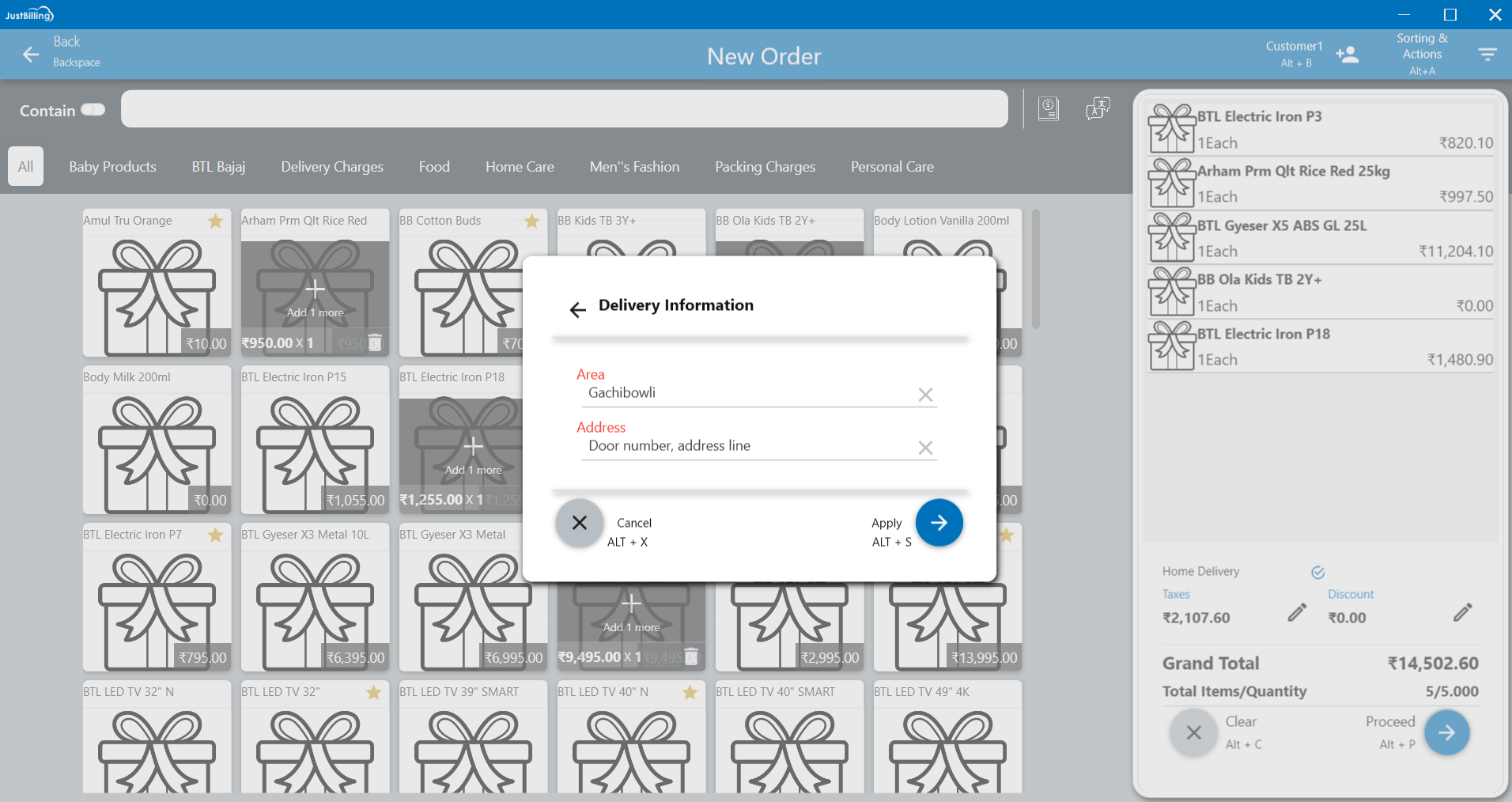 Note: If the customer name entered has an address saved from beforehand, it gets added in the Delivery Address field. You need to enter the Area name and then Save the address. If you try saving the order without entering either the area or the address, it will not allow you to save the same.