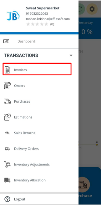 Option 2 : Other way is From Menu and Transactions and Navigate to invoice page click on Add button it will take you to invoice page where you can create an invoice.
