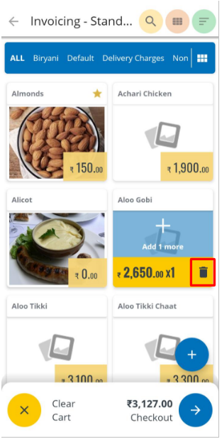 - Swipe on the product name from right to left in the billing cart. If more than 1 quantity of an item is added to cart, swiping once will remove 1 quantity only.