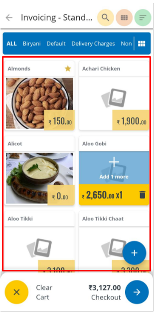 2. Product display list - All items that can be sold to customer will appear under product display list. Items will appear here based on the following criteria: