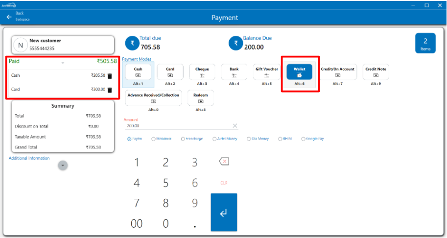 - In Just Billing application it is possible to collect payment in more than one payment mode for one bill like partial amount by card, cash, wallet etc.