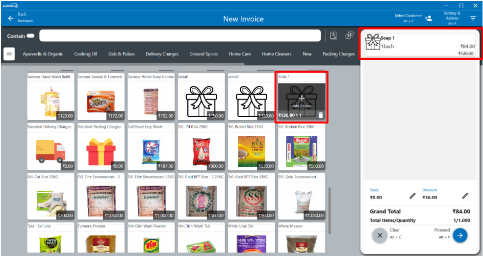 - This will open the Invoicing screen. In the invoicing screen add items to cart.
