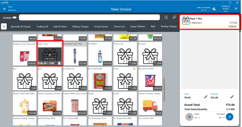 Given a 25% discount for the Pepsi brand , the item 1 Ltr. Pepsi bottle will be billed at discounted rate. The discount will be reflected after adding the product to cart (see figure 6).