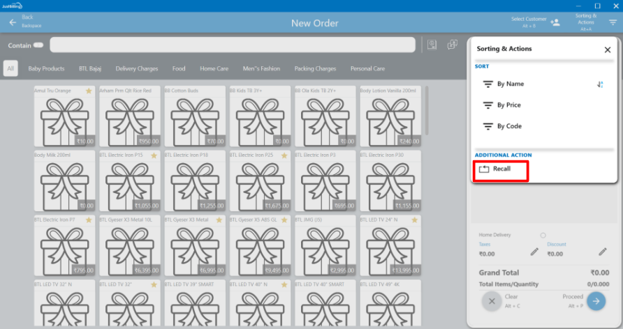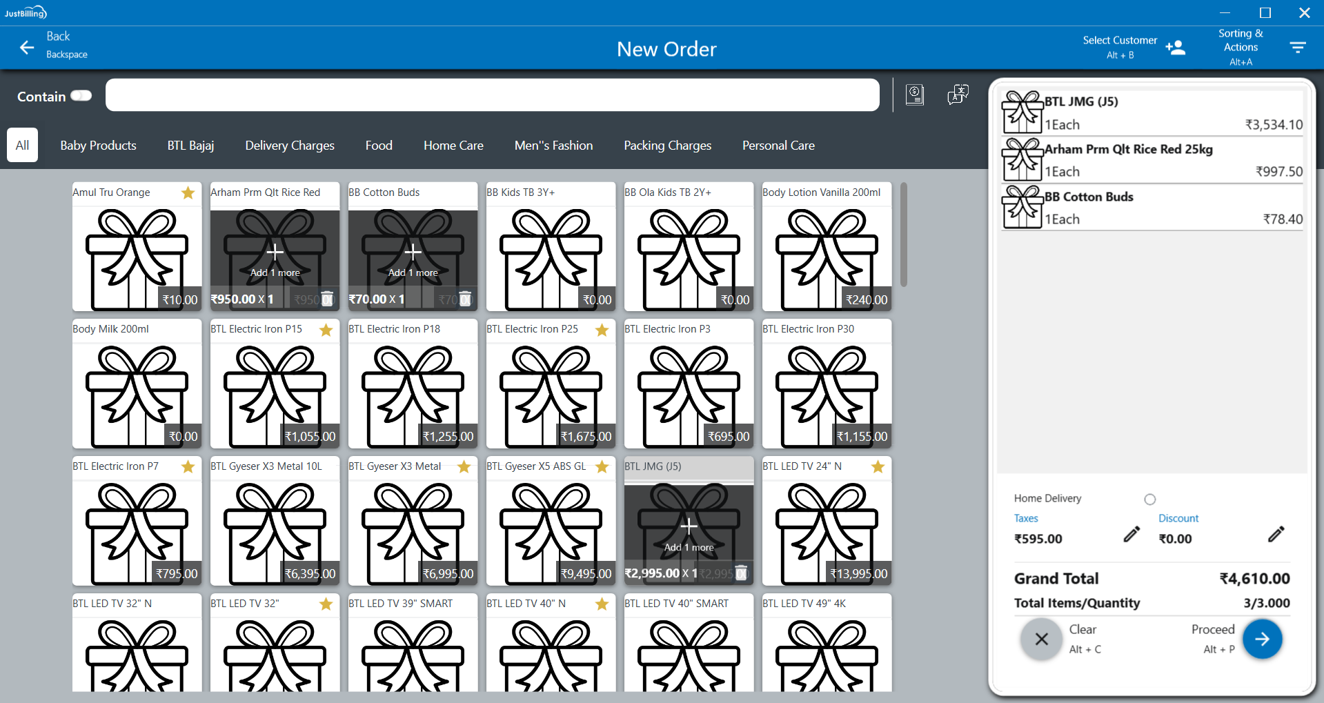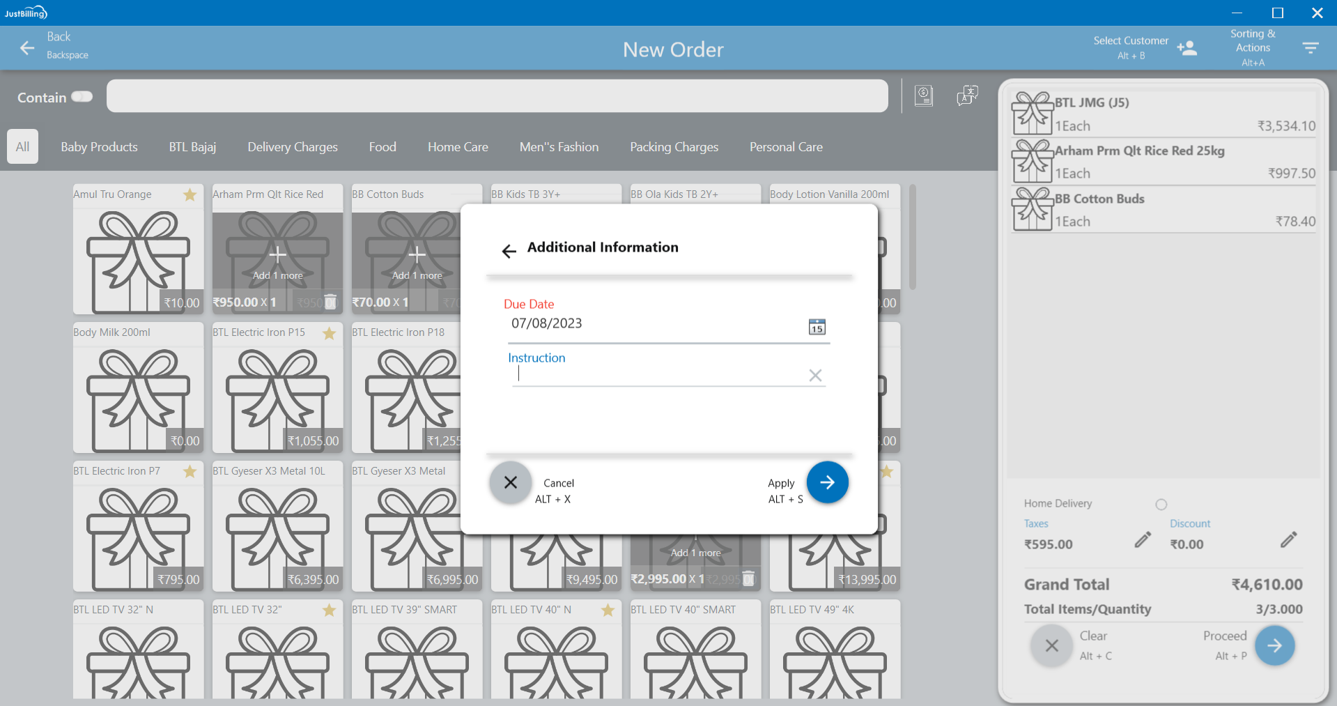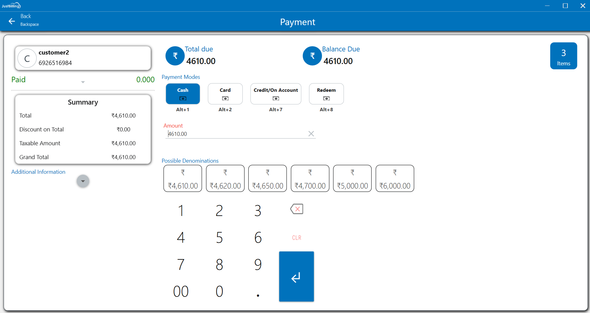 After verifying the products in the cart you can proceed to billing screen by clicking on invoice button or ALT+I