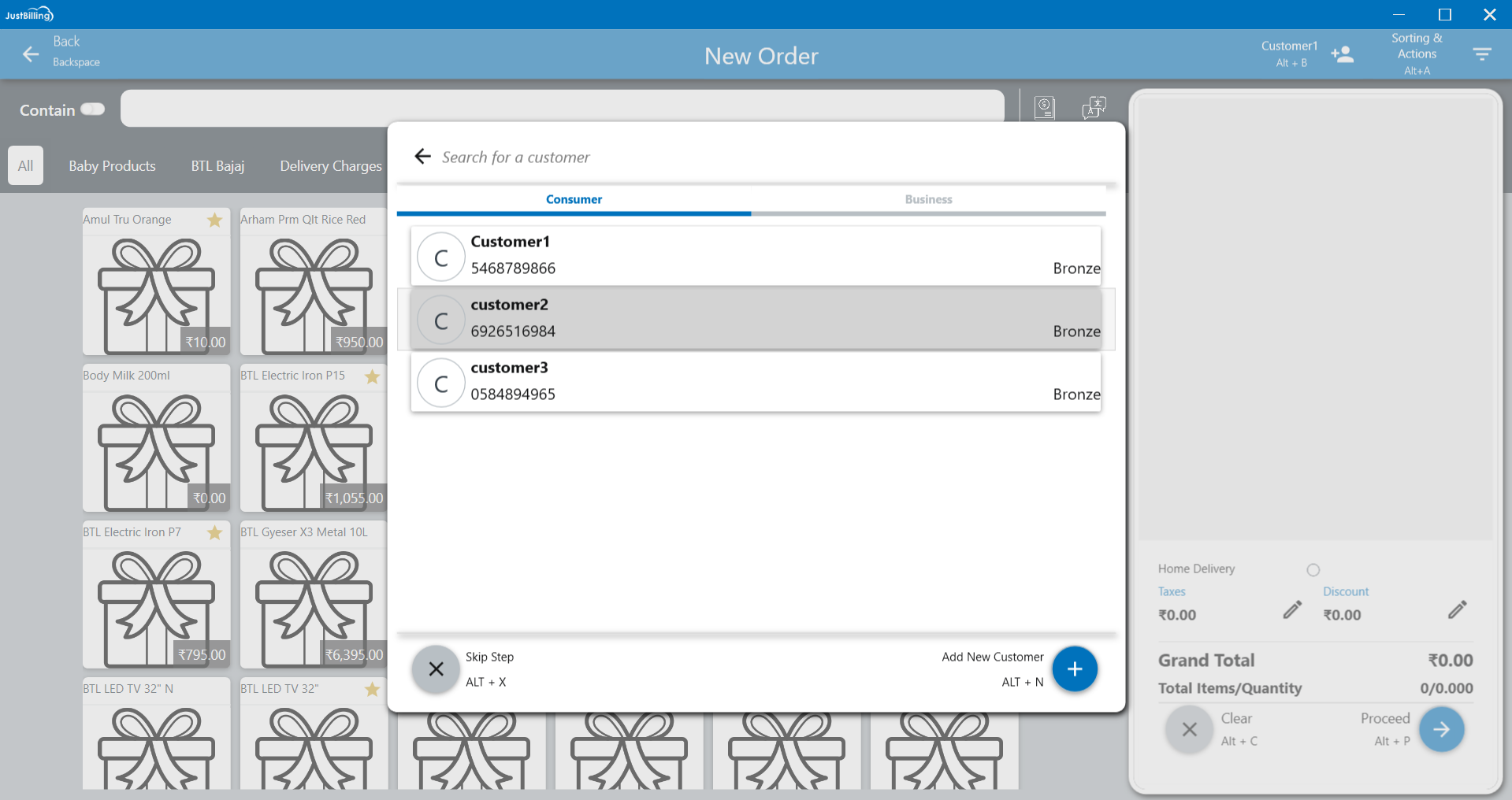 on the screen, if you want to add a customer or business click on + button or enter ALT+N. ( To select customer is not mandatory)