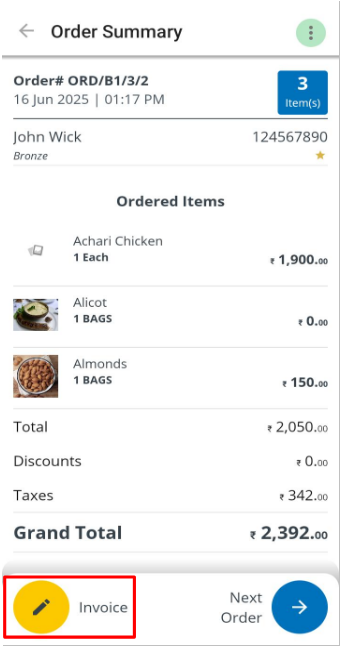 - Once the order is created if you want to create the invoice then recall from Invoice screen.