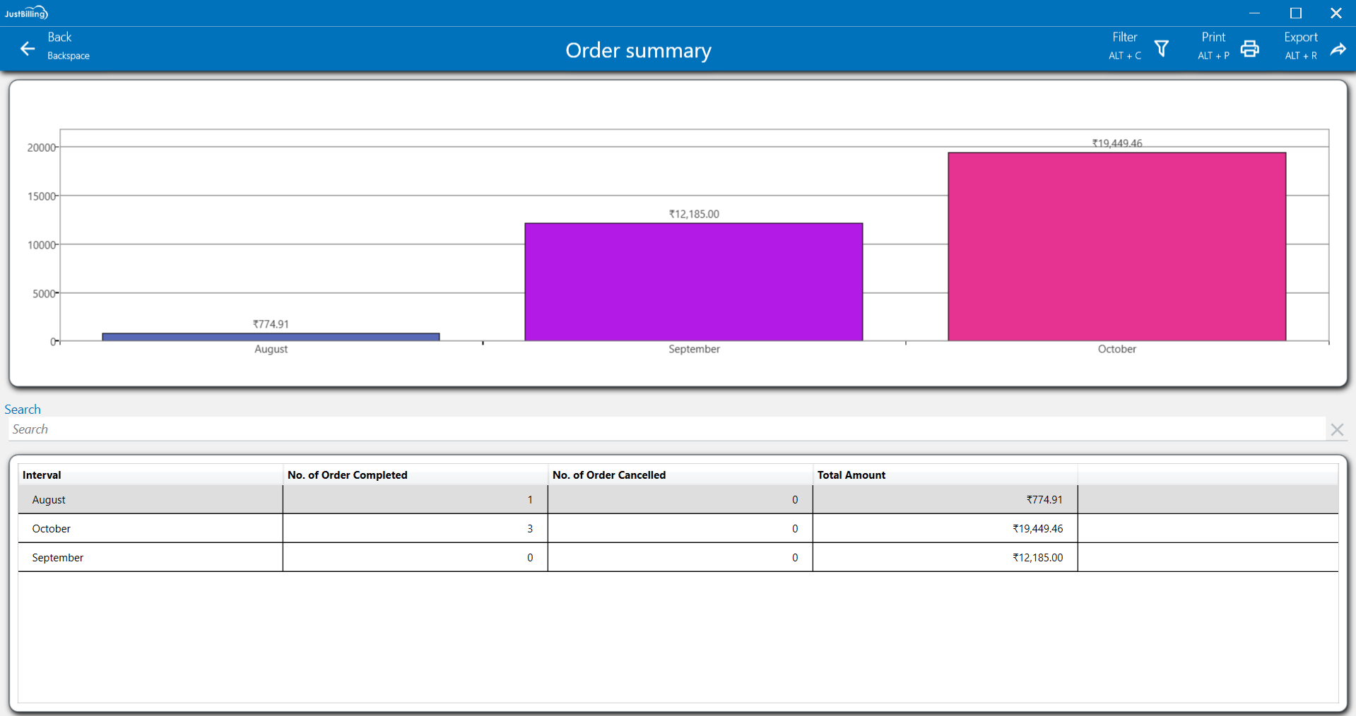 In this report users can generate and view all the sales orders summary of all sales orders. Order summary generated based on the selected Interval. This reports also gives users a quick glance of the Number of sales orders completed, Number of orders canceled and Total amount of orders.