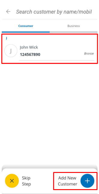 Note: You can search for existent customers by typing the name or phone number of the customer in the Type here to search field or add a new customer by entering the mobile number, name and other details in the corresponding fields.