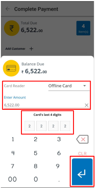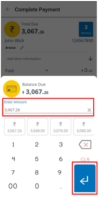 - The Payment screen will show the Bill Amount, Balance/Change Amount and total Cash being paid by the customer. Tap on enter to generate the bill. This will redirect you to the Billing screen once the payment has been completed.(see figure 5)
