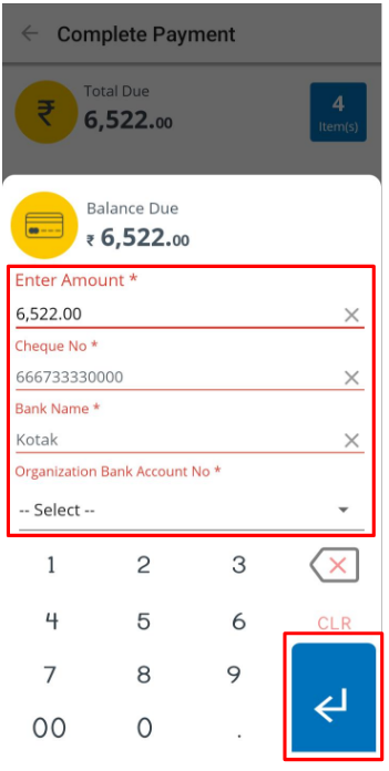 Another payment method available in Just Billing is Cheque wherein customer provided cheque details (Cheque No, Bank Name, Amount) can be captured in the system to complete the payment.(see figure 9)