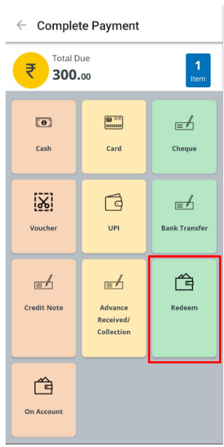 - When a customer is selected at the time of billing, you will get all the payment modes that is Cash, Card, Voucher, Cheque, Redeem, Wallet and on Account.