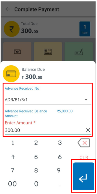 - Additionally it also provides number pad to enter the specific value to pay from Advance received.