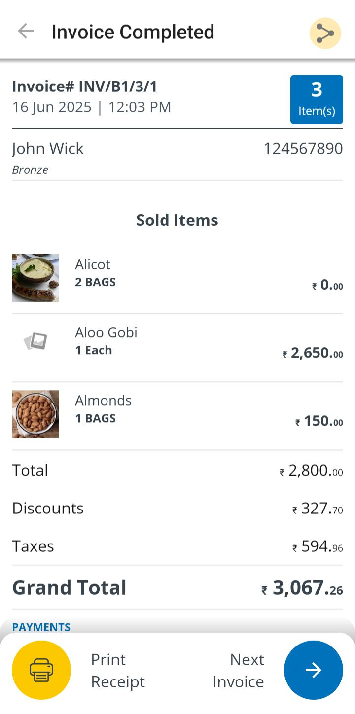 You can either share the bill via sms/email or print it as per customer demand or Skip the process to go on with the payment process.(see figure 15)