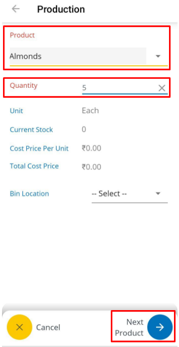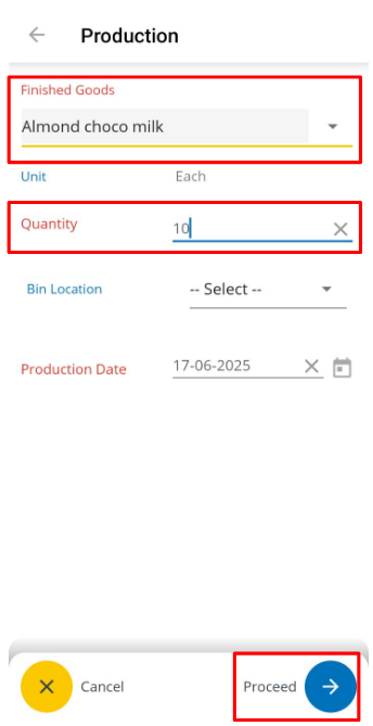 (Figure 2 : Select Finished product and quantity enter Screen)