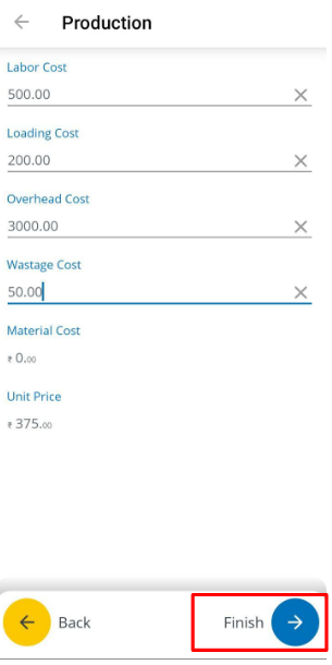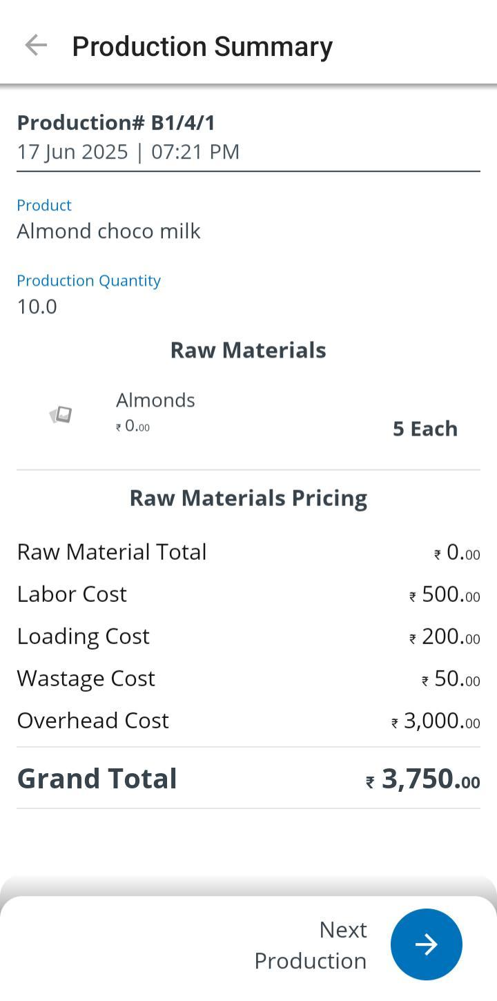 Note: When you enter the Quantity for raw materials, application automatically calculates its cost price. If you want to add additional costs such as the labor cost, overhead cost, loading cost and wastage cost, you can do so manually and Save the record. The unit cost of production in this case will be calculated by considering the Material Cost + Additional Cost (Labor/Overhead/Loading/Wastage).