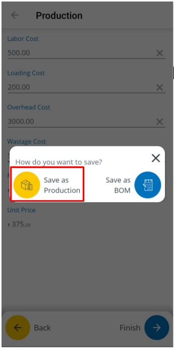 - You have option to save as Production " use this option to save as production where the inventory of final product gets added and inventory of raw materials will reduce.