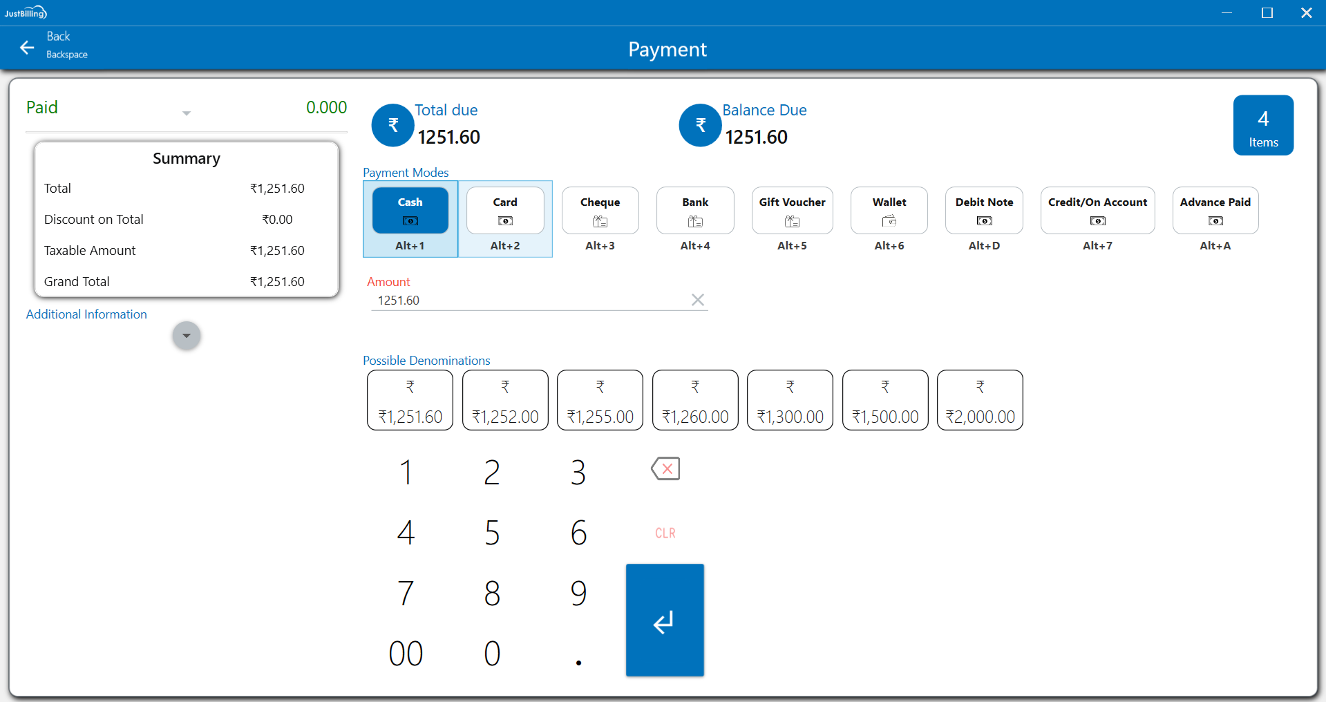Note : Detailed Explanation of Billing screen and Payment Modes are available in Billing screen and Payment pages respectively