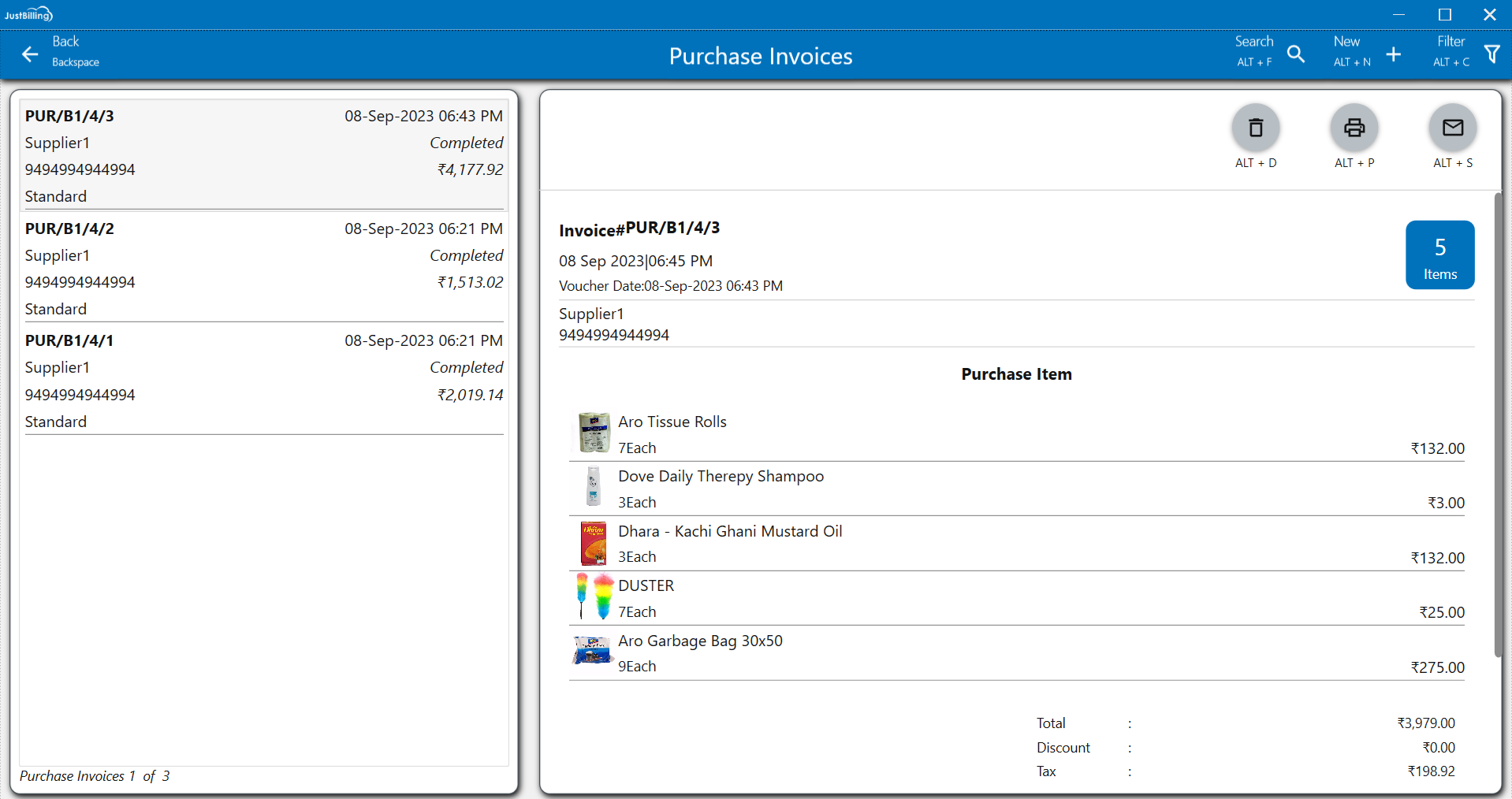 - You can Print, Share and Email the Purchase invoices by clicking options available for Print, Share and Email respectively