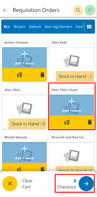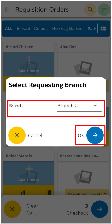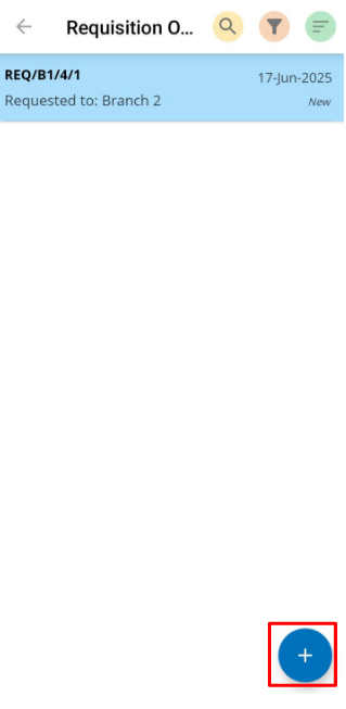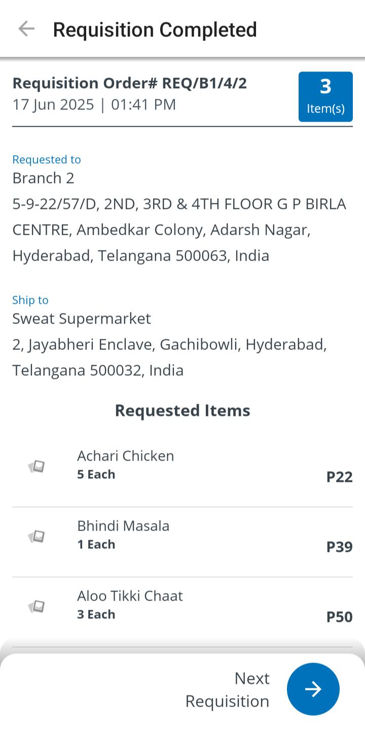 From this screen, you can create a Requisition order from the app. Requisition order is created in a branch against to other branch for which stock transfer out will be done by other branch against the requisition order. Requisition order can be done from Android as well as Back Office.