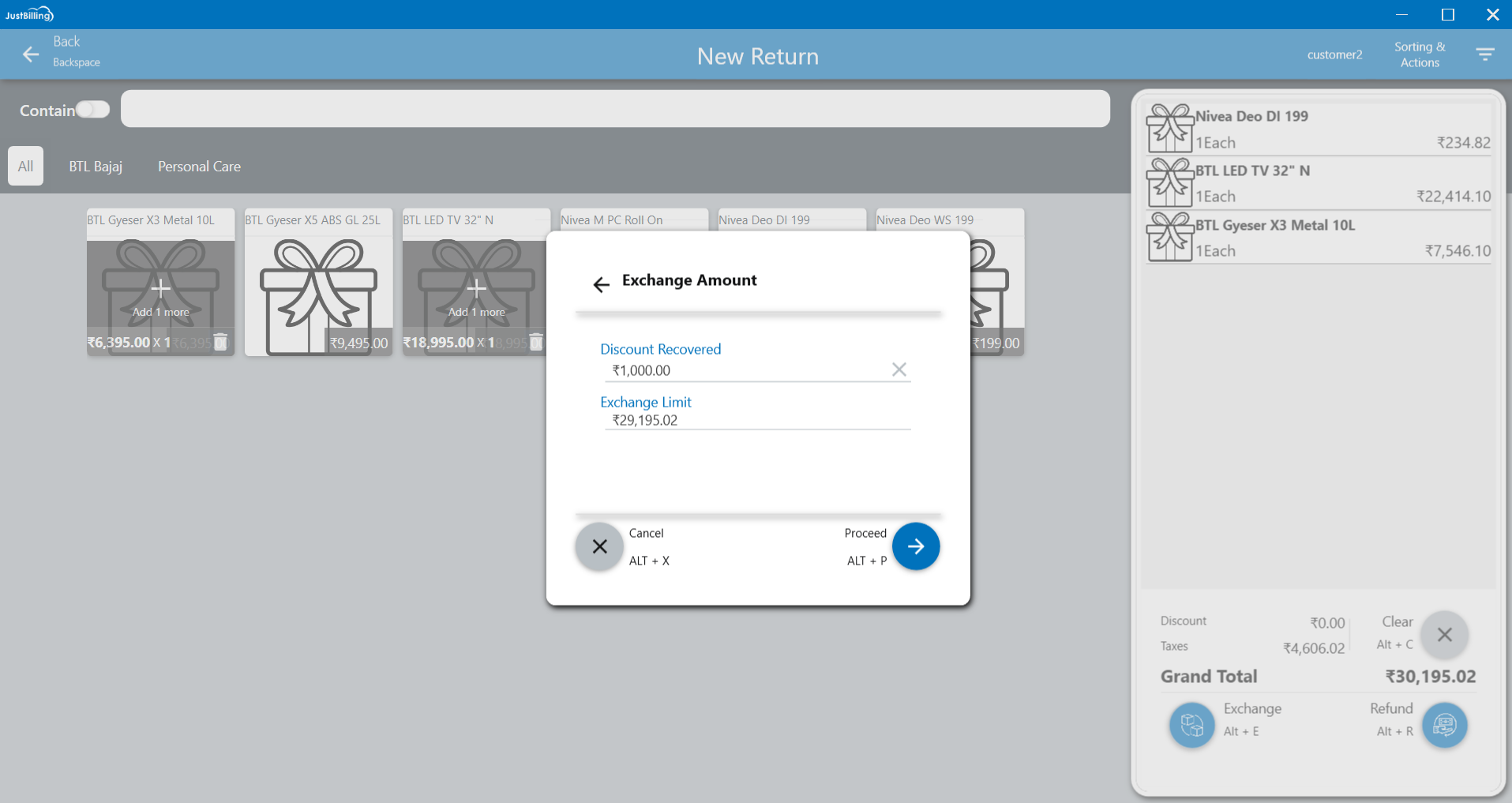 Clicking on the “Exchange” button will display the popup to enter the Discount recovered amount, if applicable enter the discount amount and click on proceed or enter ALT+P to select the items for exchange as shown in (Figure 8 - Exchange amount).