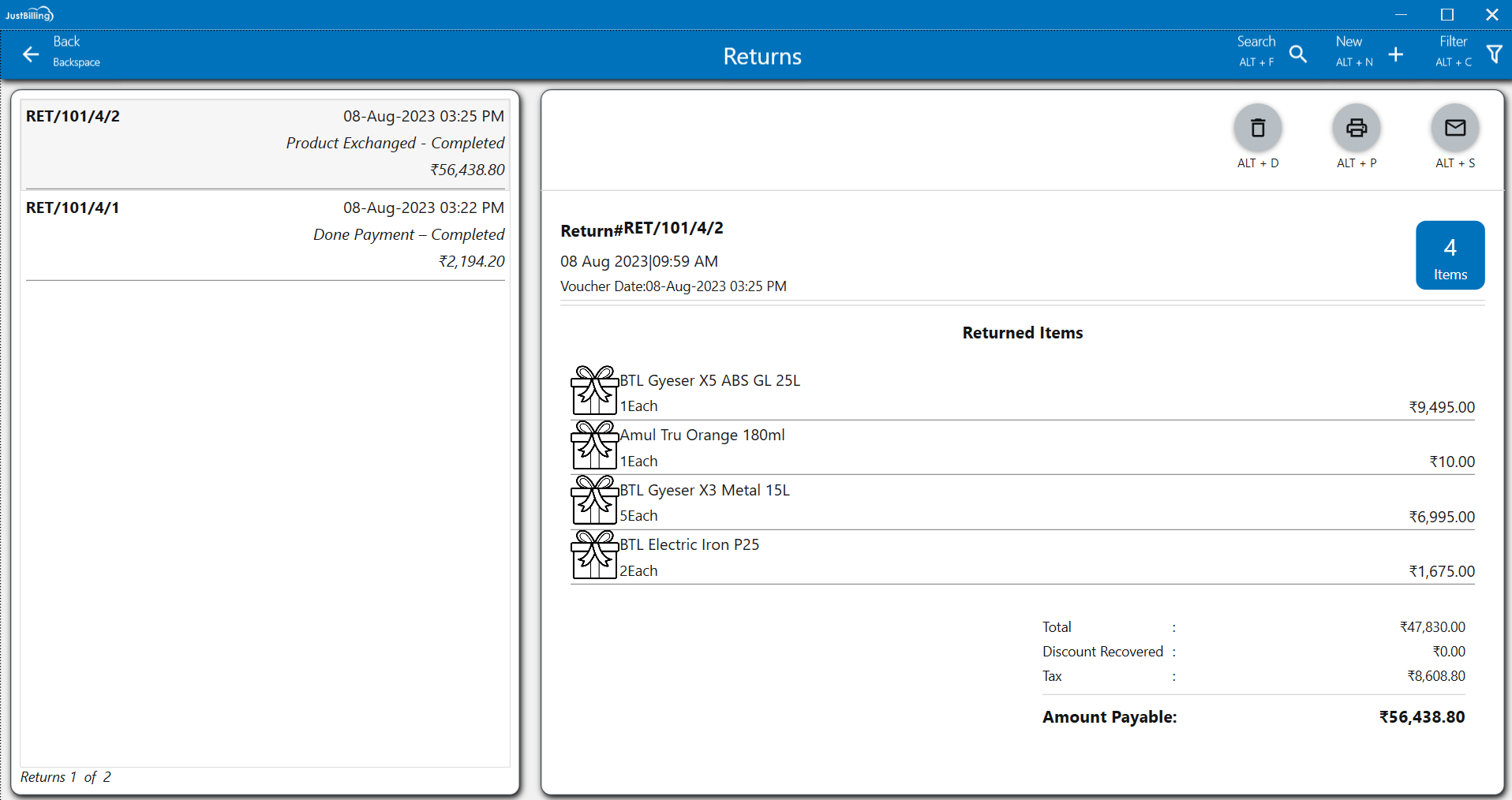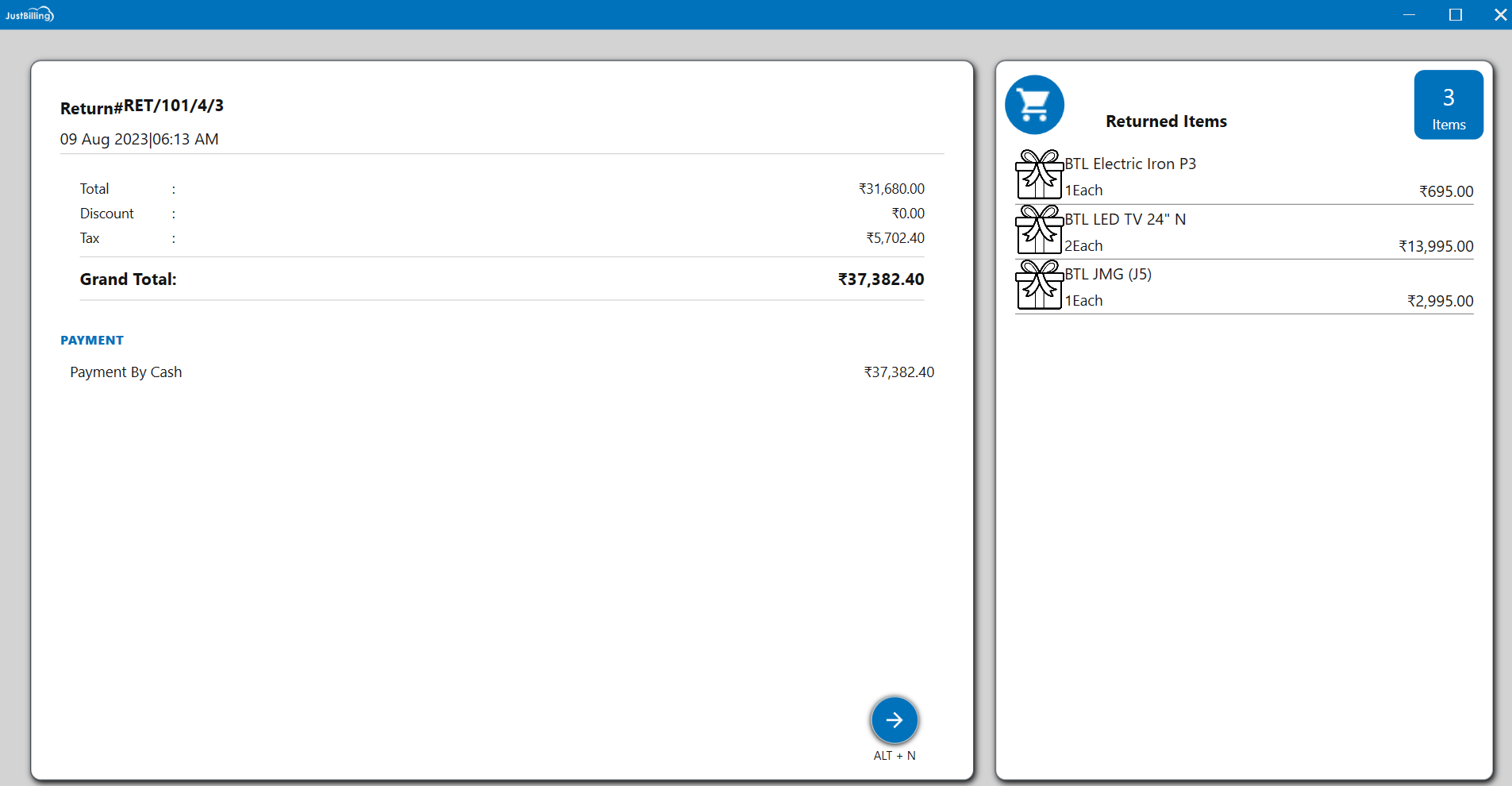 After clicking enter, Invoice is generated and you will be redirected to invoice screen, click on Next button to view the list of exchange and return items.