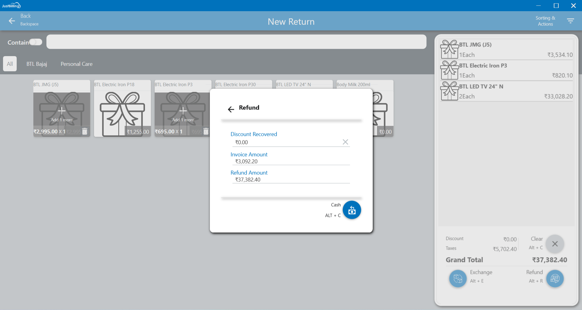 Validate/edit the discount recovered amount and click Cash button or enter ALT+C to refund the amount to the customer by cash.