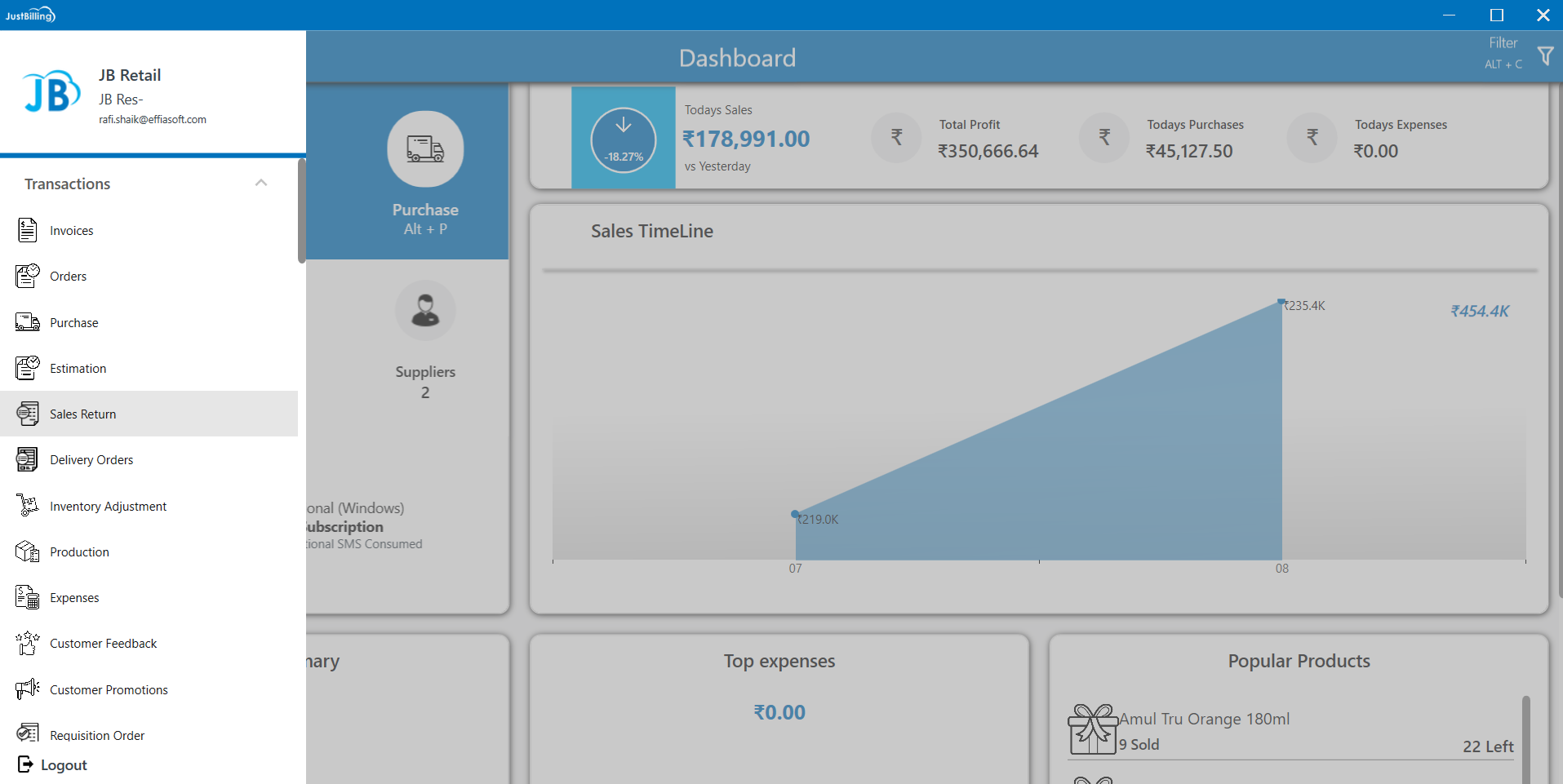 To initiate a Return process, click on the Sales Return button in Transactions from side menu (see figure 1).