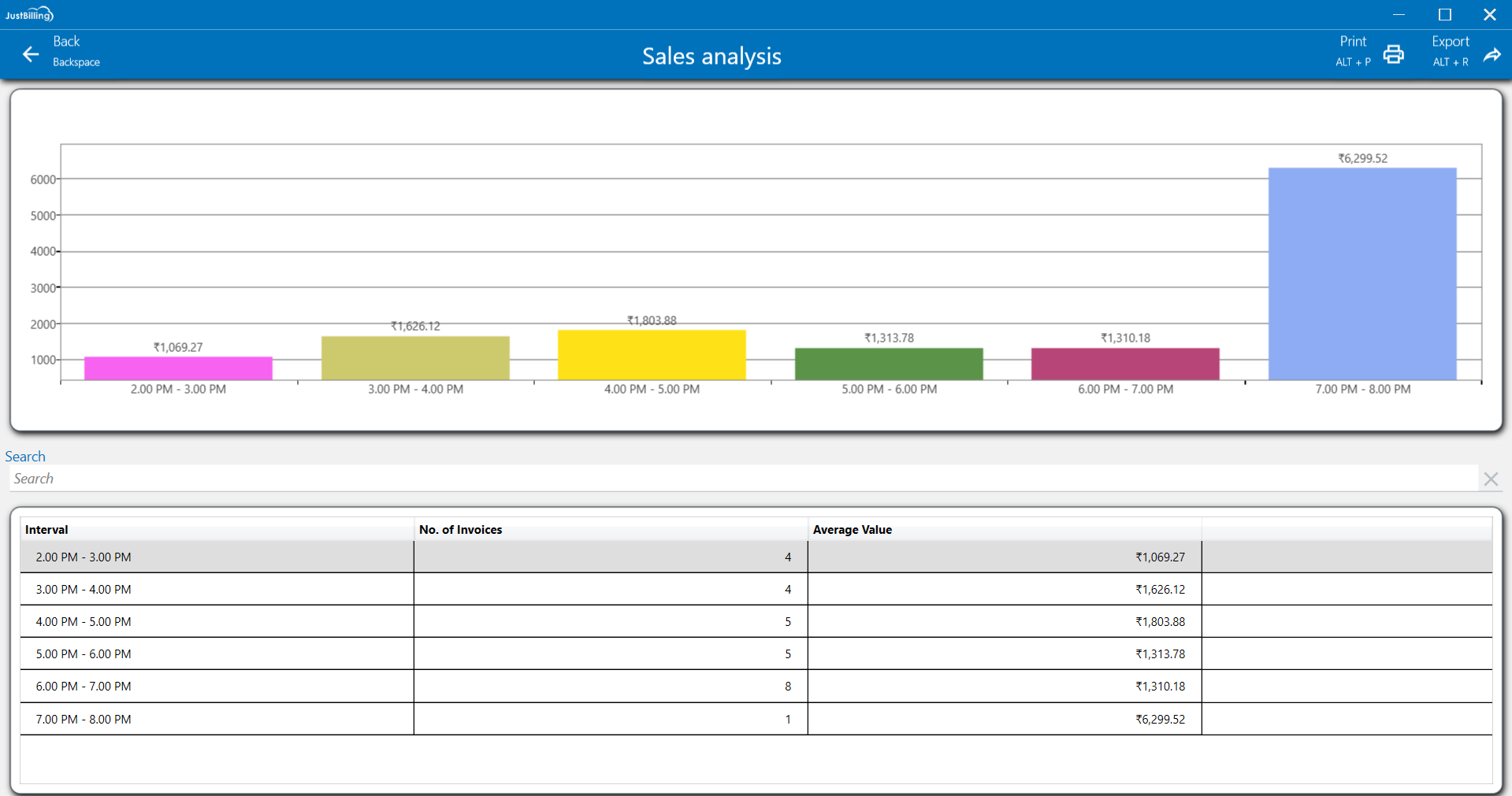 This "Sales analysis" report visually breaks down your sales performance across different time intervals, such as "2:00 PM - 3:00 PM" and "7:00 PM - 8:00 PM." For each interval, you can see the "No. of Invoices" and the "Average Value" of sales. This helps you identify peak sales periods and customer activity patterns.