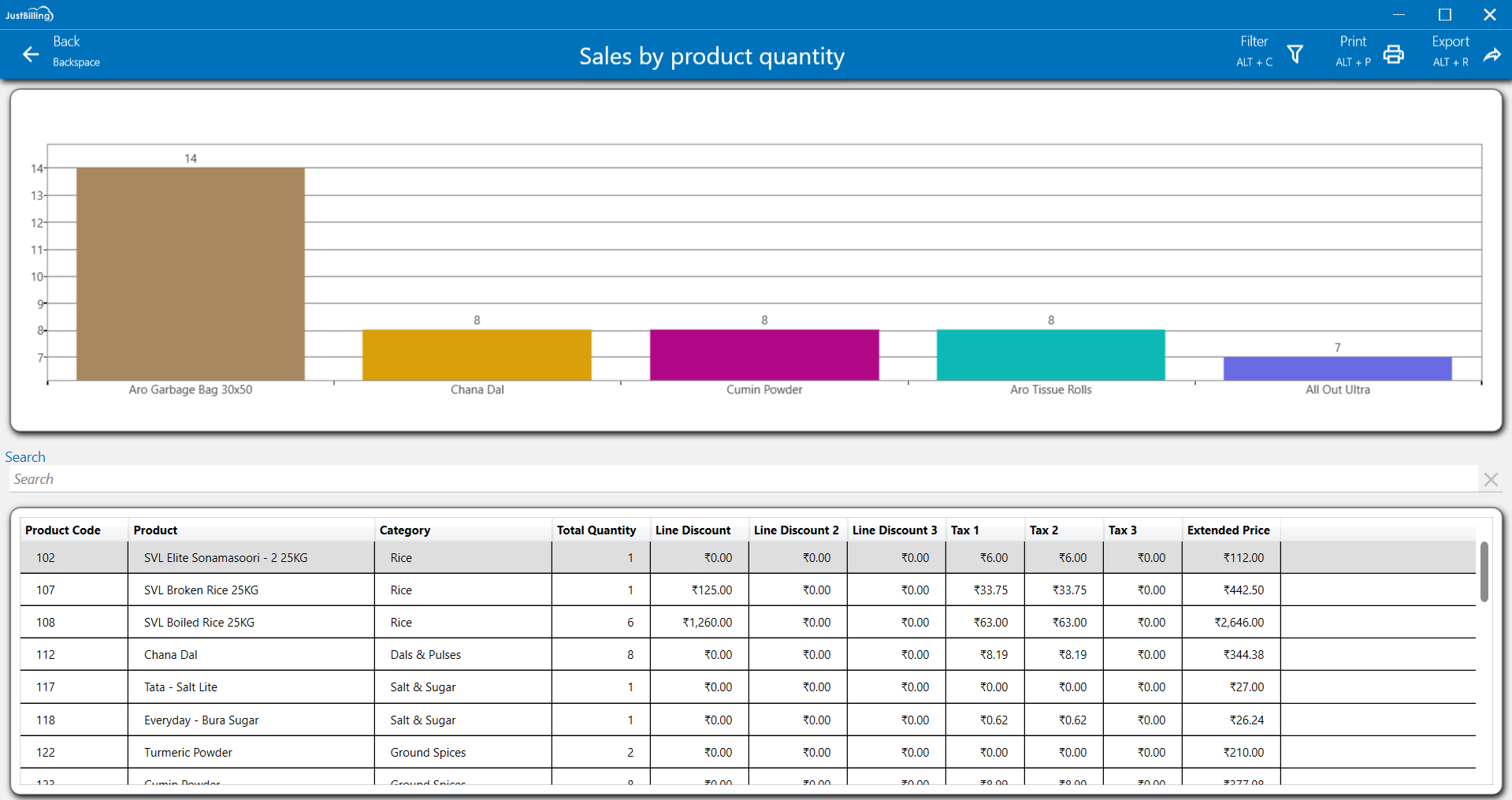 This "Sales by product quantity" report displays how many units of each product have been sold, such as "Aro Garbage Bag 30x50" or "Chana Dal." You can see the "Total Quantity" sold for each item, along with any discounts and taxes applied. This report helps you quickly identify your best-selling products by volume.