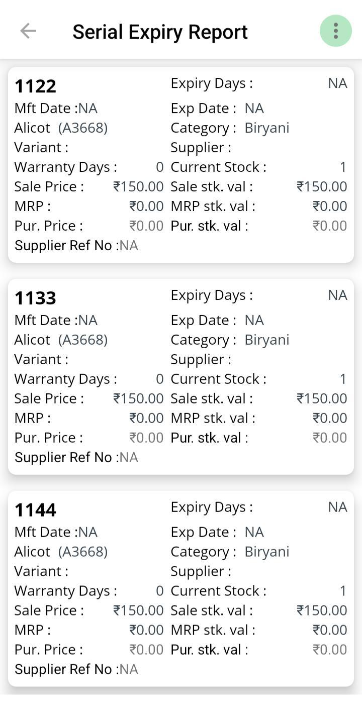 This "Serial Expiry Report" helps you track individual items," by their unique serial numbers. You can see details such as the "Current Stock" quantity, "Sale Price," and relevant expiry information, if available. This report is crucial for managing products that have individual tracking or warranty periods.