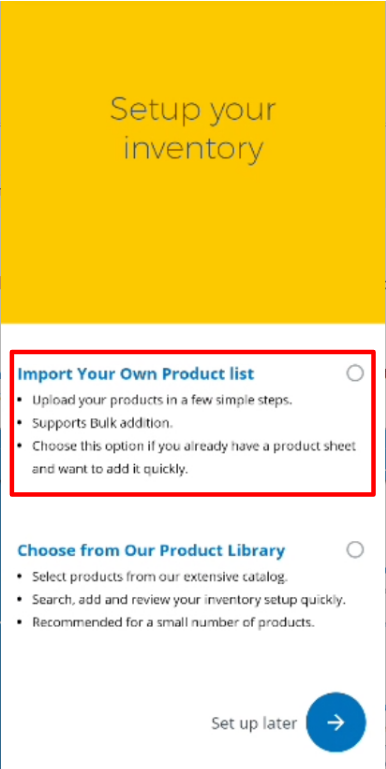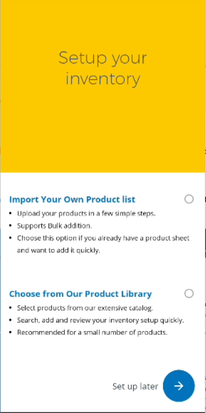 After completing the configuration, you will be directed to the Inventory setup screen to add your inventory with two options: 1.Import your own product list 2.Choose from our product library.