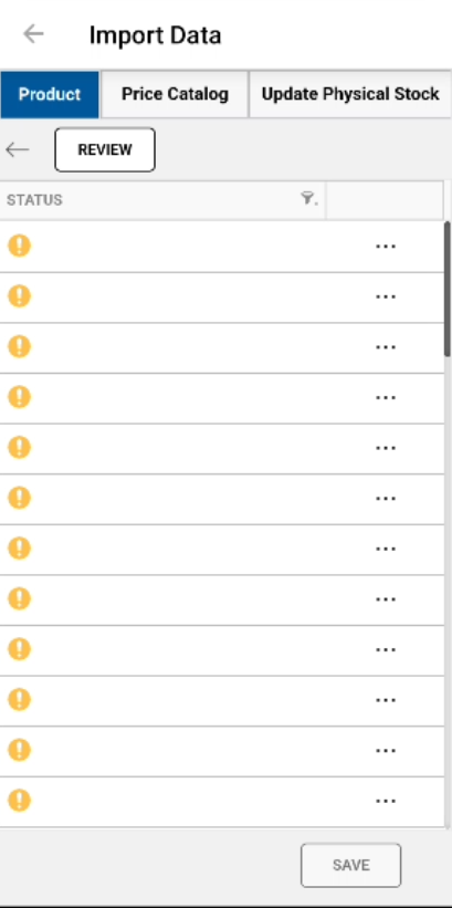 Step 2: After uploading the document, you will be redirected to the review screen with 3 tabs such as Product, Price catalog and Update physical stock (see figure 16)
