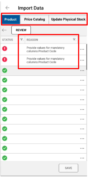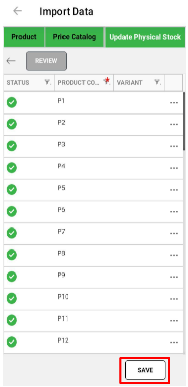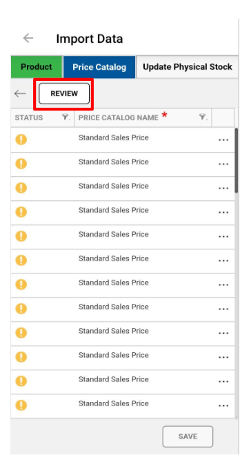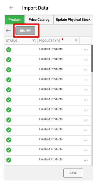 Step 4: After uploading the document, you will be redirected to the review screen with 3 tabs such as Product, Price catalog and Update physical stock (see figure 6)