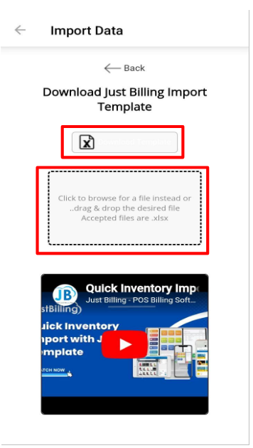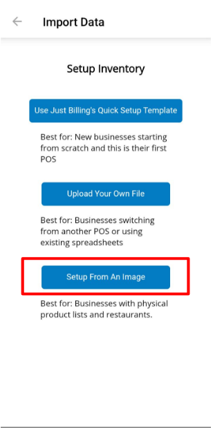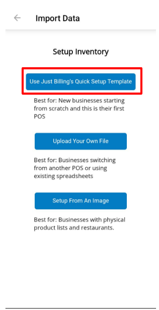 You can choose any of the options - Use just billing quick import template, upload your own file, setup from an image and scan menu (for restaurant) (See figure 3 )