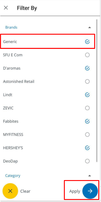 Click on Apply Filter to display products based on the selected category or brand. To remove the applied filters, click on Clear Filter within the filter popup. This will reset the product list to show all available items.(see figure 6)