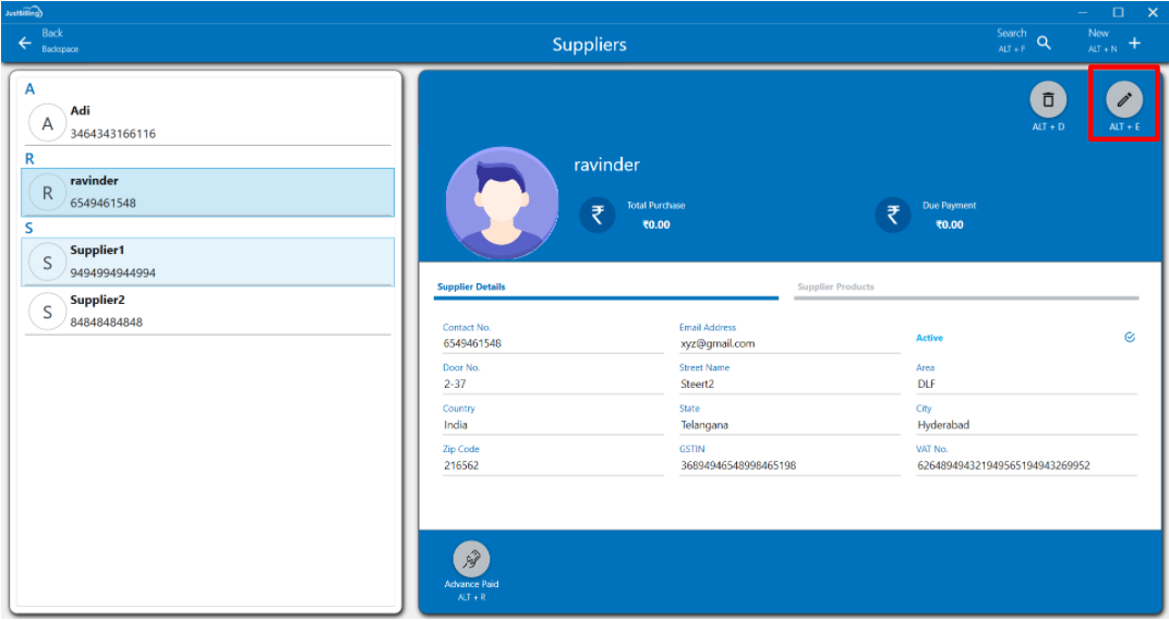 5. On Saving, the Suppliers page is updated and reflects in JB Windows application under Suppliers page.