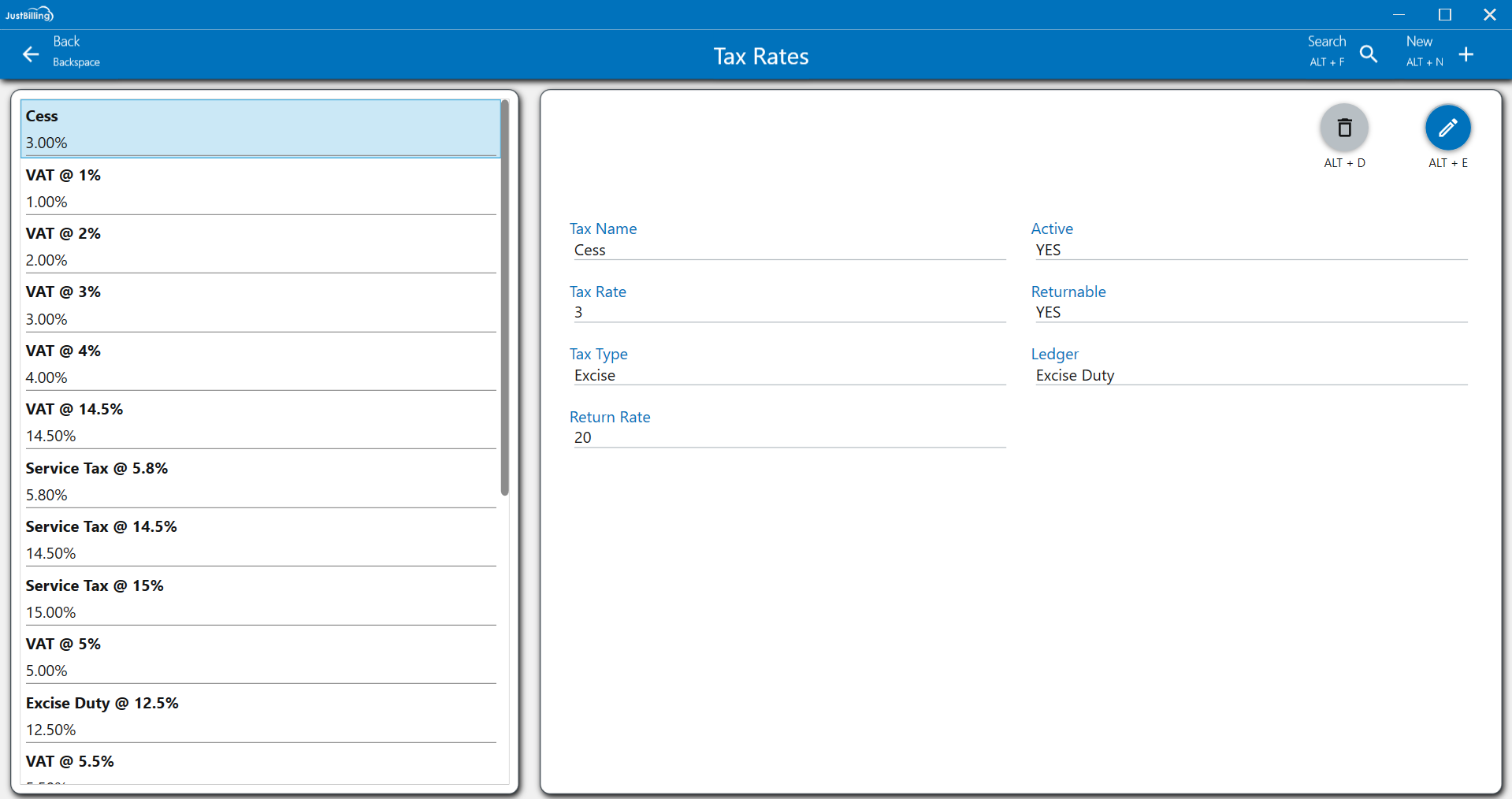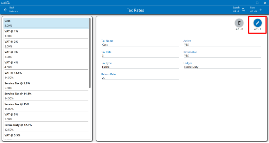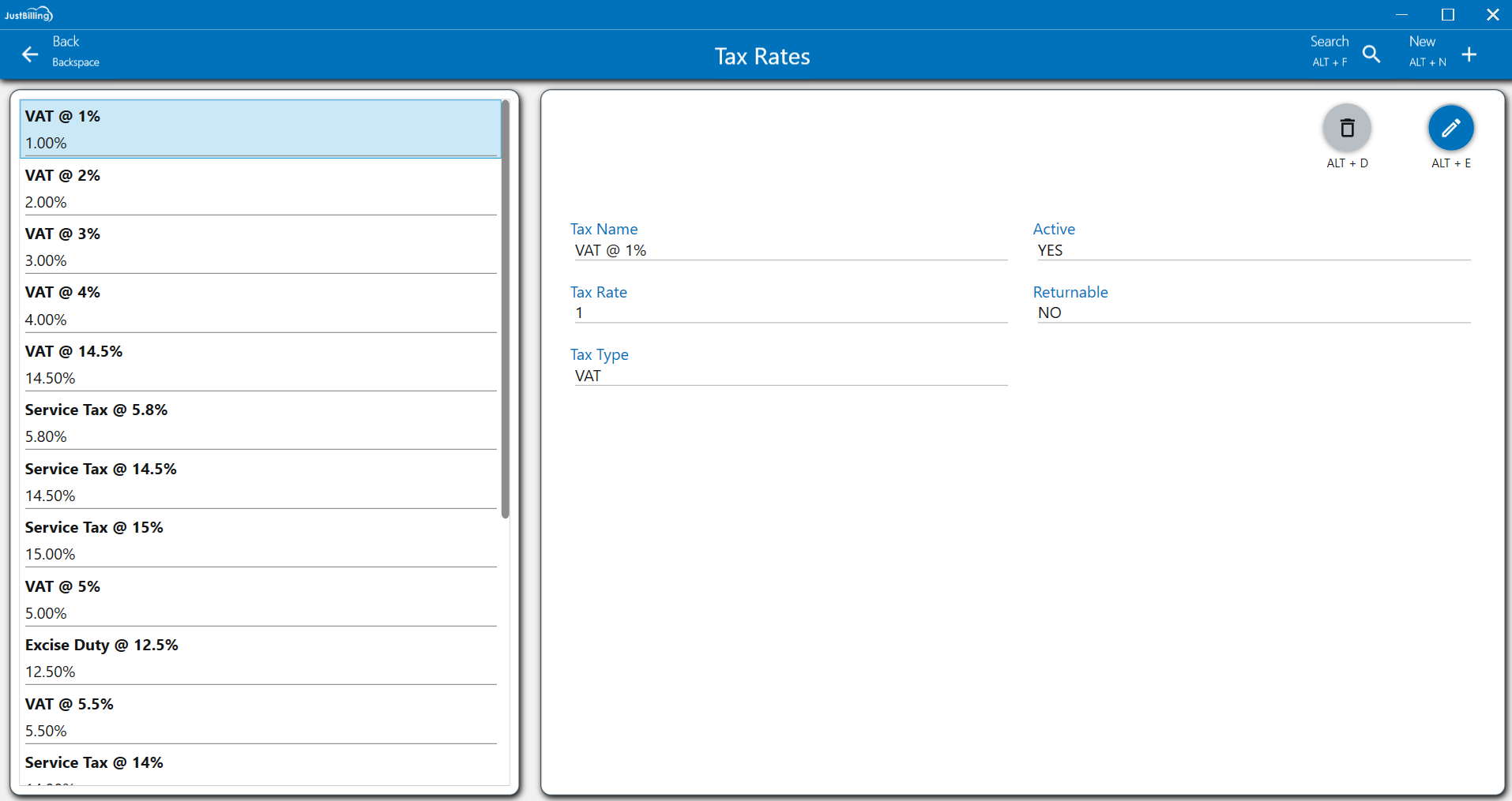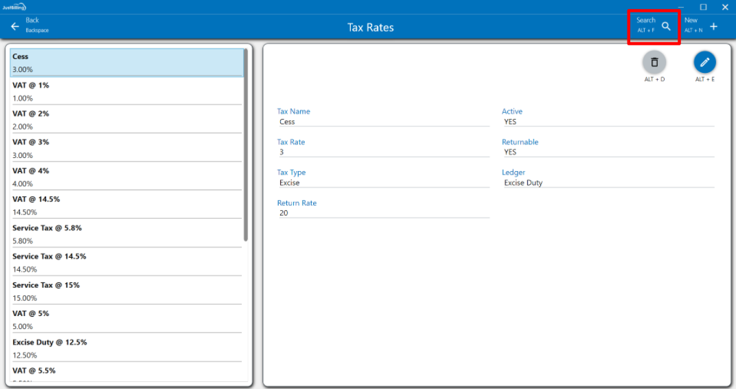 Note: Tax rates page added from Just billing application will get synced to JB cloud Back office by Auto Sync.