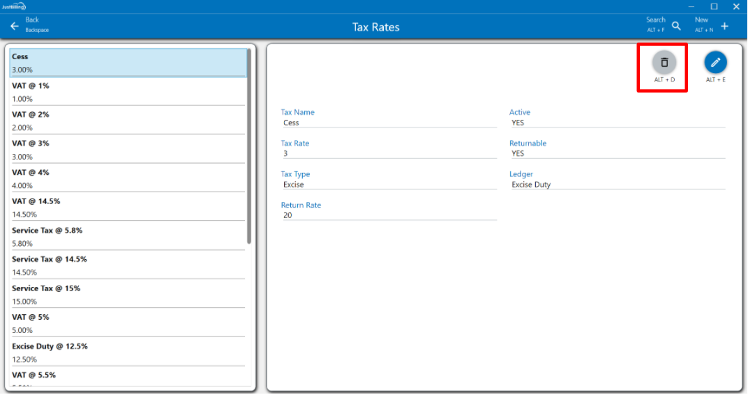 (Figure 5 - Delete Tax rates in JB Windows Application)