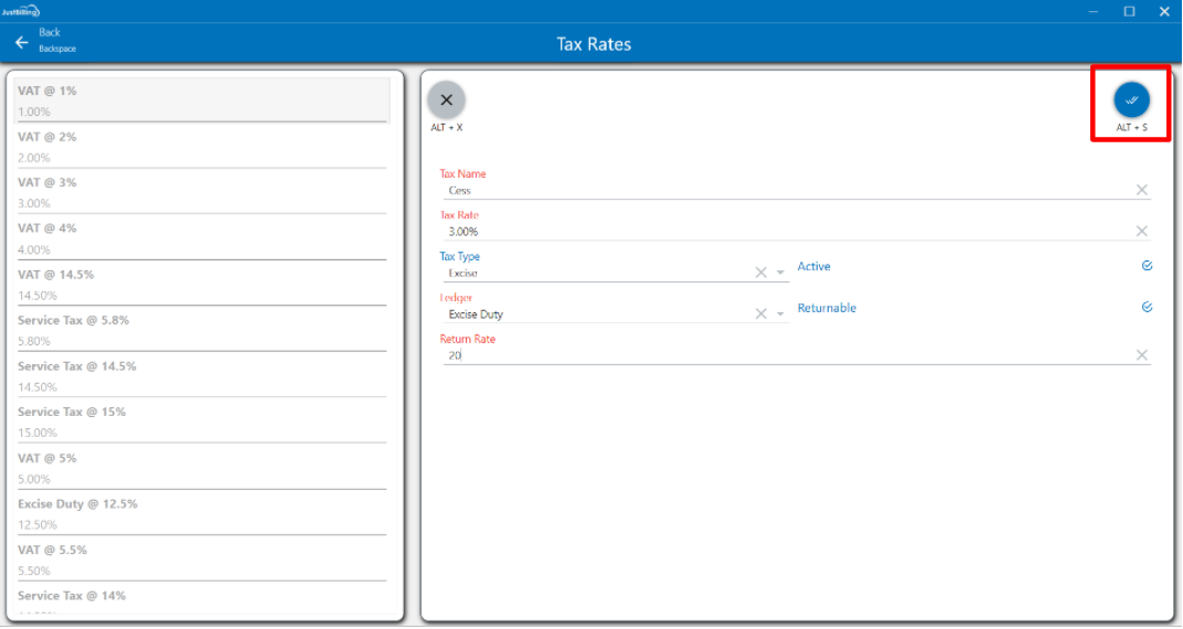 5. On Saving, the Tax rate page is updated and reflects in JB Windows application under discount rules page.
