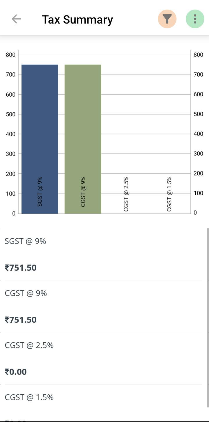 This "Tax Summary" report provides a clear overview of your collected taxes. It details the amounts for SGST and CGST at different rates, like 9%, 2.5%, and 1.5%. You can quickly see how much tax you've collected in total for each category.