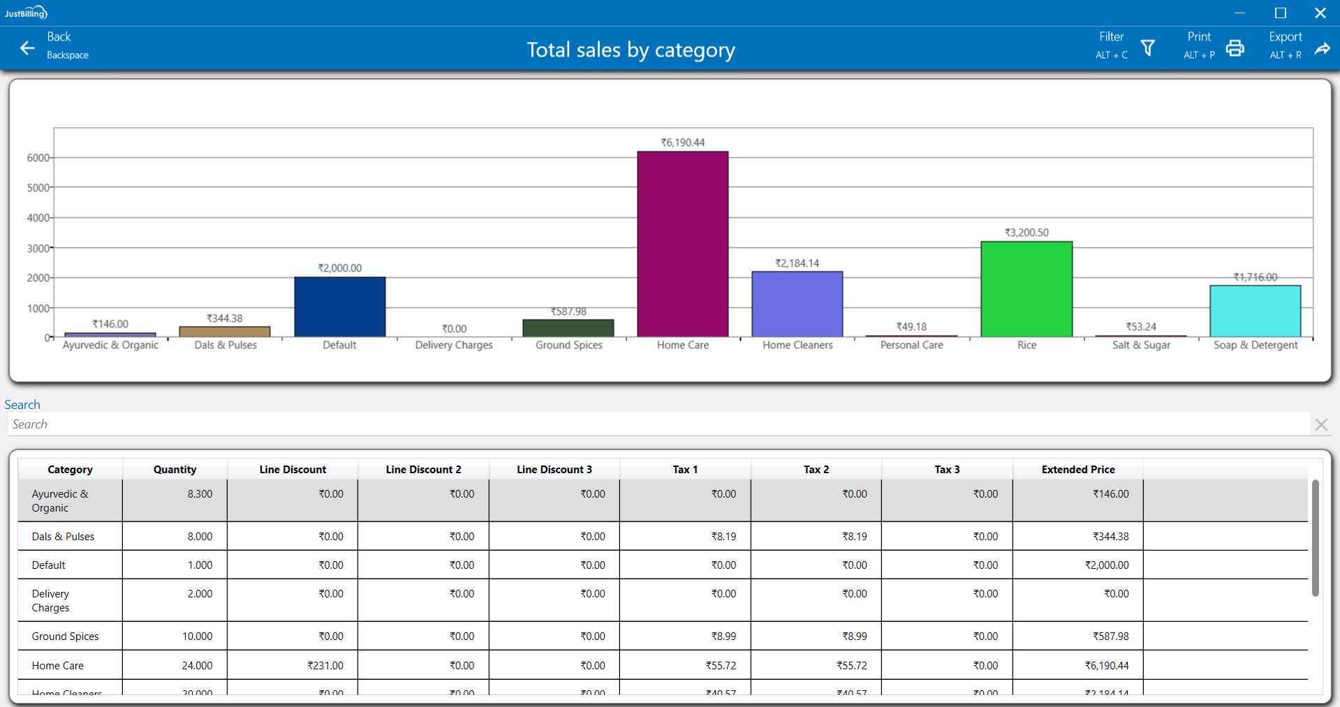 This "Total sales by category" report shows your sales performance across different product groups, like "Home Care" or "Rice." You can see the "Quantity" sold for each "Category," along with any discounts applied ("Line Discount") and collected taxes. This helps you understand which product categories are performing best.